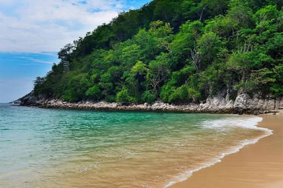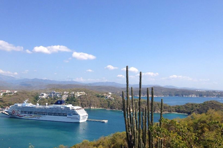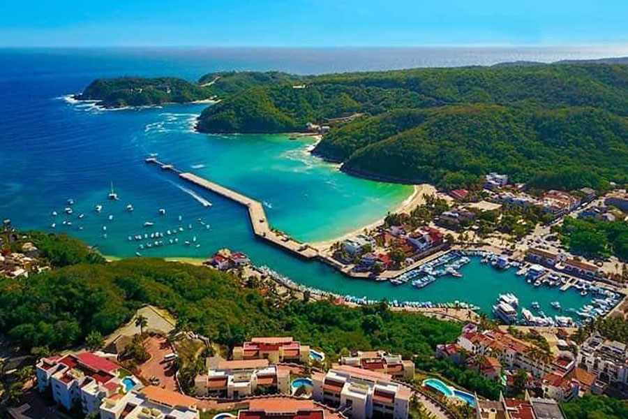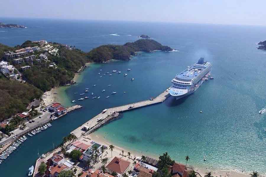 Maravillosa playa de Huatulco, Oaxaca con muelle para el arribo de cruceros y divertidas actividades acuáticas.
