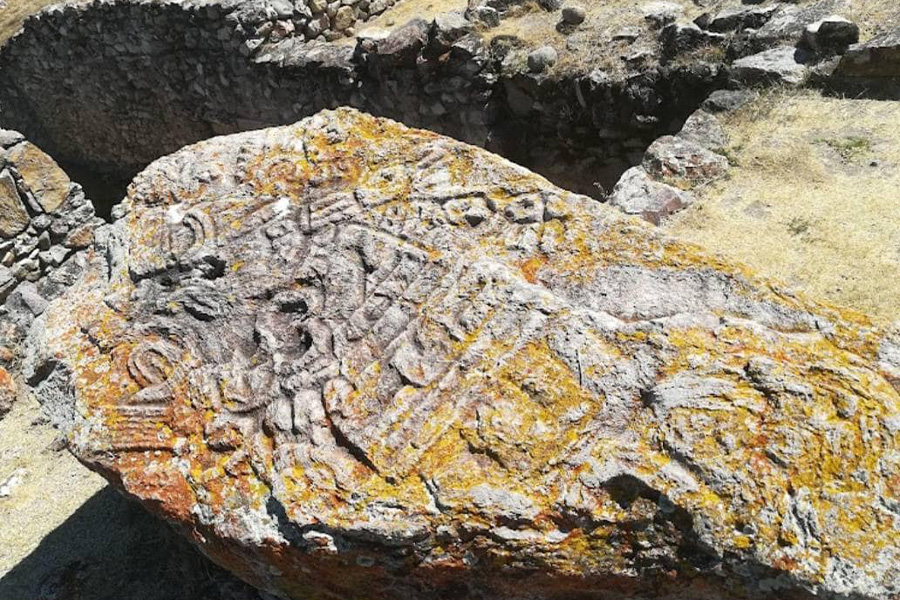 Entre éstos figuran las cuatro probables deidades del juego de pelota, cuya factura puede calificarse de espléndida. En la cima del cerro se encuentran otras cabezas o caretas de los jugadores, grabadas en las rocas. Edificio G. Es una gran plataforma con escalinatas, patios y aposentos, delimitados por muros de piedra. En este espacio destaca una estela que representa un personaje, y una tumba, cuyo dintel y jambas representan, en bajorrelieves, la figura de un jaguar. Juego de Pelota. Está clasificado como un juego de pelota con cancha en forma de doble T, reconstruido en parte. Tiene dos plataformas laterales con un muro en talud hacia la cancha de juego. Cronológicamente está ubicado hacia el año 1000 d. C. Evidentemente, por la época a la que pertenece, carece de relación con los jugadores del edificio principal.