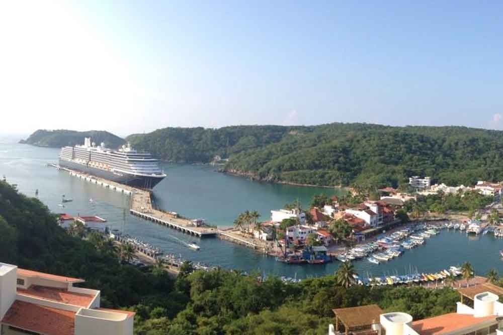 Maravillosa playa de Huatulco, Oaxaca con muelle para el arribo de cruceros y divertidas actividades acuáticas.