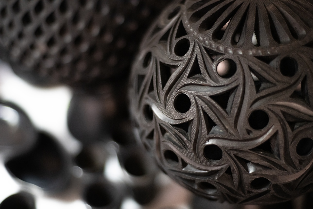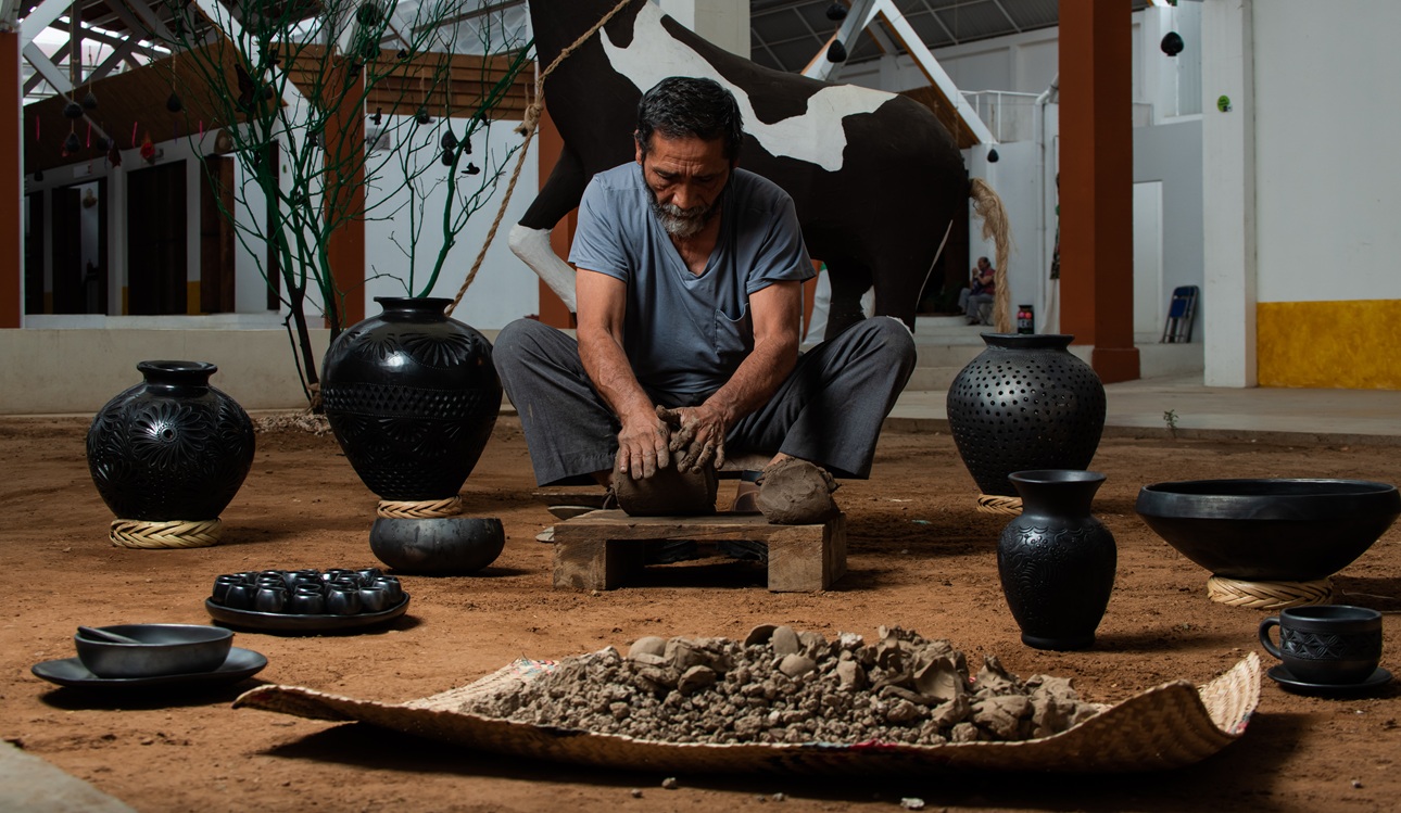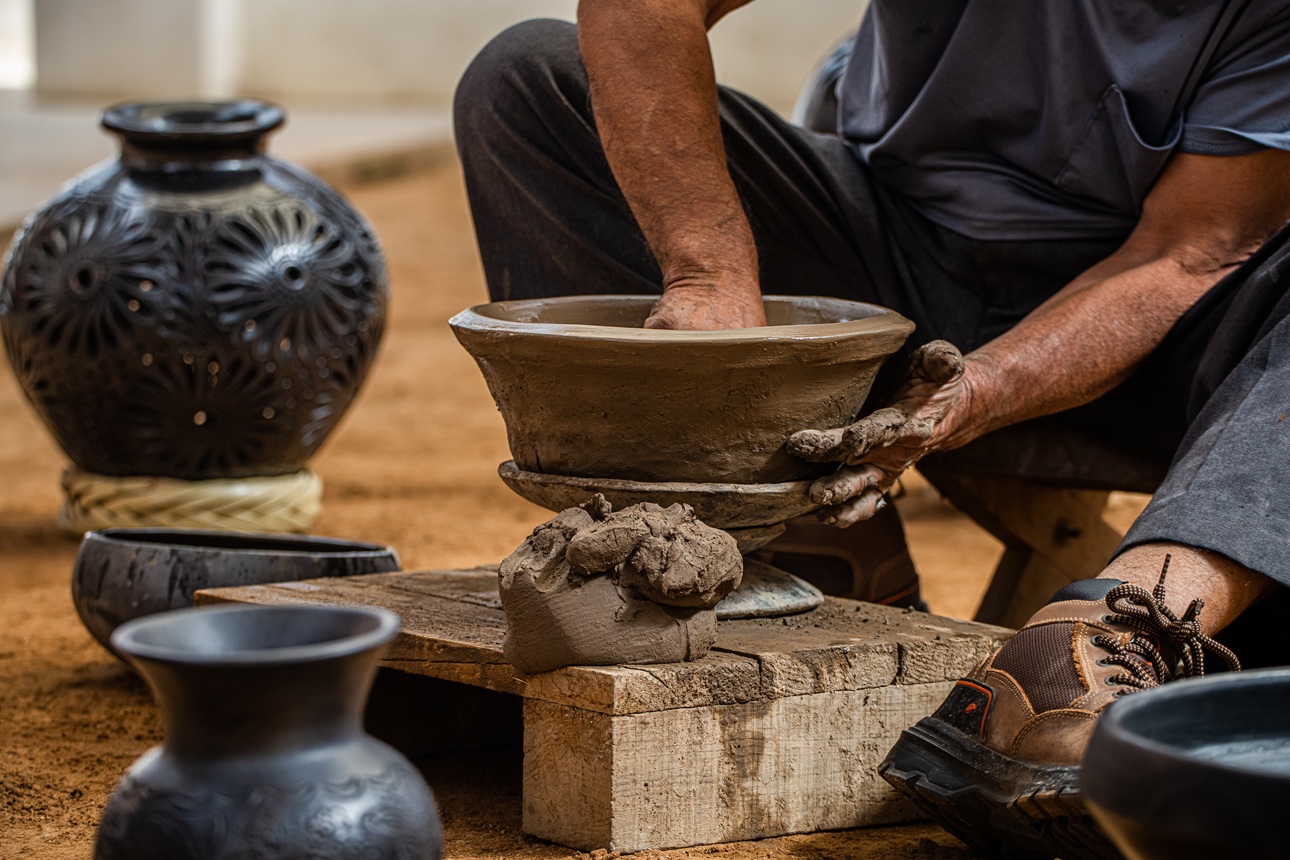 Posteriormente, una técnica de cocción que data de la época precolombina, que se conoce como "reducción de atmósferas" y se lleva a cabo en un horno tradicional de leña llamado "de dos bocas" es lo que da a la cerámica de Coyotepec su elegante y característico color negro.