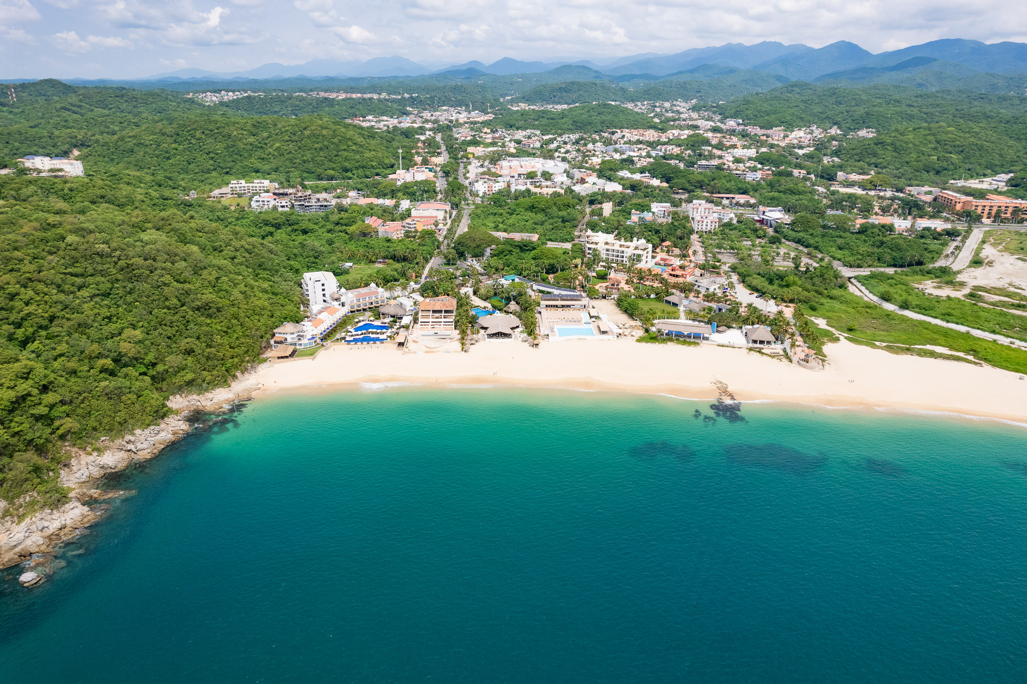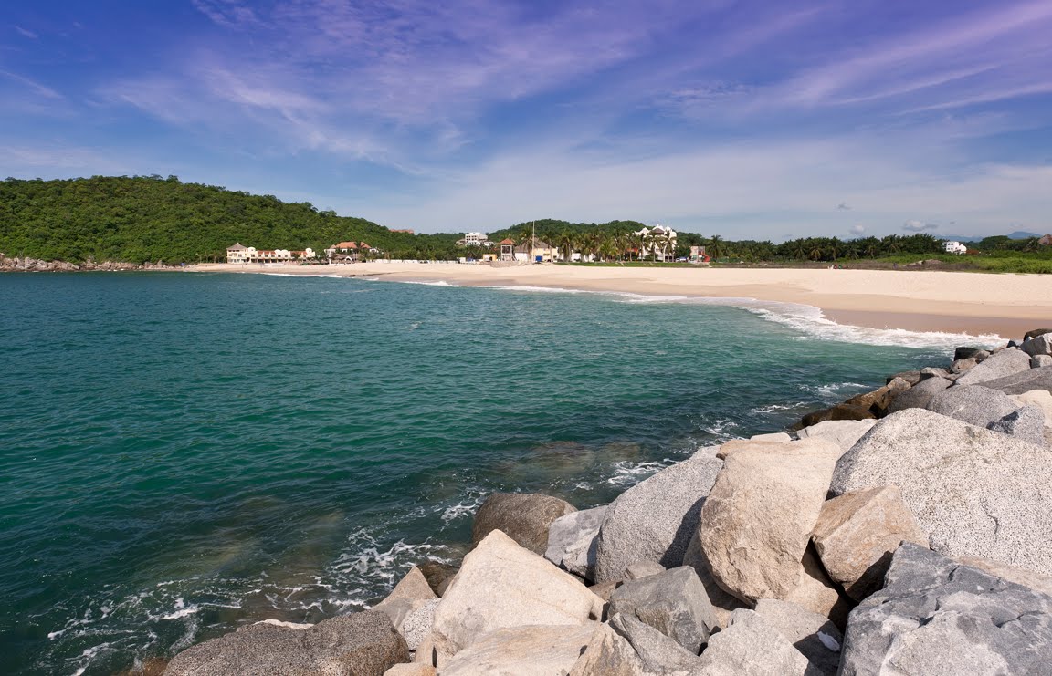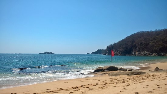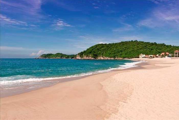 Relajante playa de Oaxaca con agua color turquesa, arena es fina y de color dorada debido a la humedad que deja el oleaje del mar.